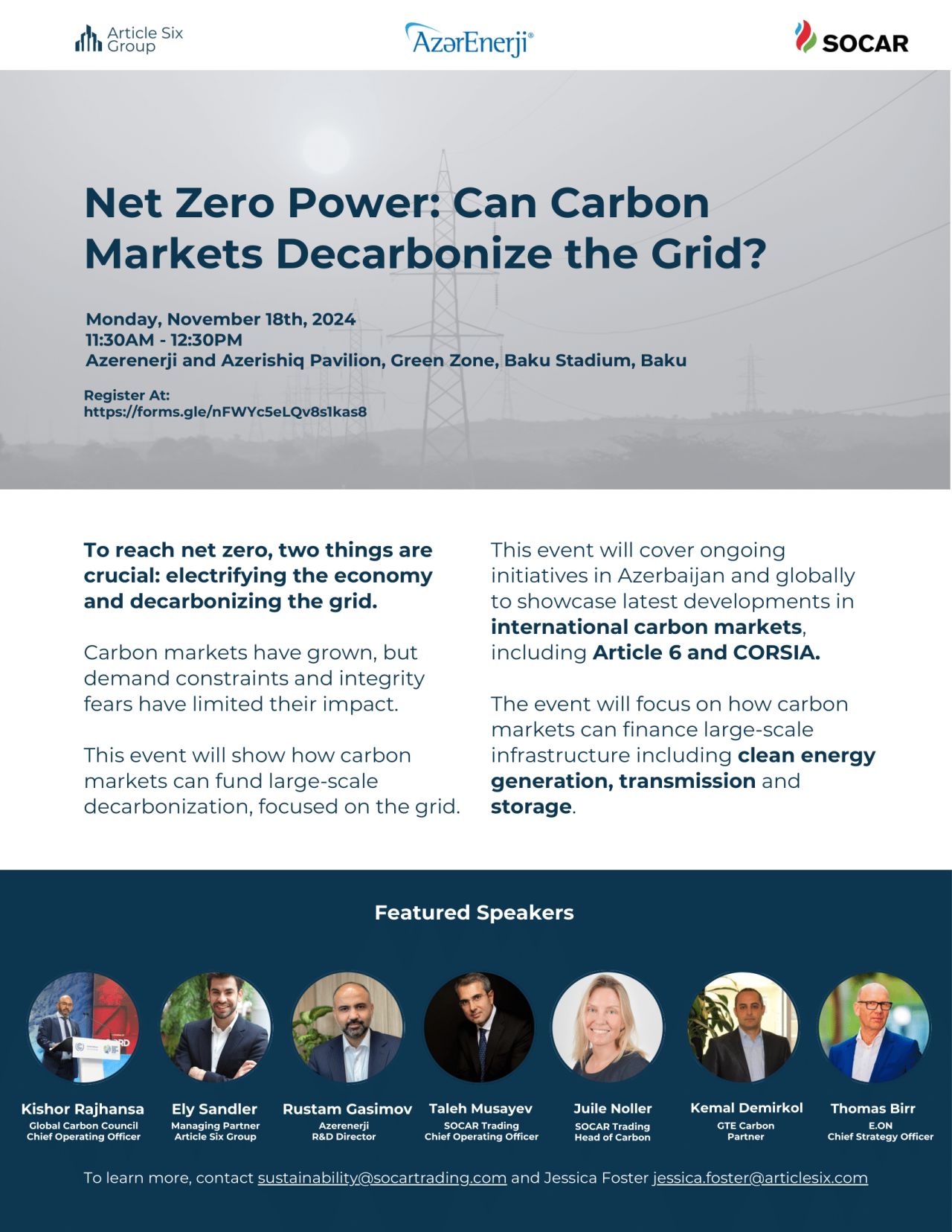 Among the speakers we had: Elnur Soltanov (CEO of COP29), Afgan Isayev (Vice President of State Oil Company of the Republic of Azerbaijan (SOCAR), Ely Sandler (Managing Partner of Article 6 Group), Taleh Musayev (Chief Operating Officer of SOCAR Trading), Marisa Drew (Chief Sustainability Officer of Standard Chartered), Landon Derentz (Senior Director, Atlantic Council), Julien Perez (Managing Director, Oil and Gas Climate Initiative, (OGCI)), Mark S. Brownstein (Senior Vice President, Environmental Defence Fund)